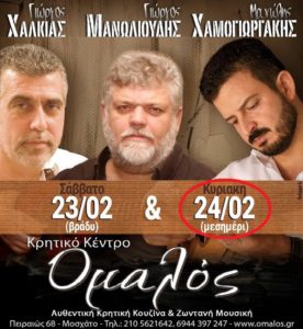 Την ερχόμενη Κυριακή 24 Φεβ 1:00μμ, στον ΟΜΑΛΟ, Πειραιώς 68 Μοσχάτο, μενού 15€. Κράτηση θέσεων στα γνωστά τηλέφωνα, υποχρεωτικά λόγω περιορισμένων θέσεων.