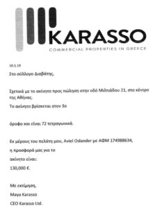 • Πωλείται χώρος 2 γραφείων, 74 τ.μ., αυτόνομων σε δικό τους όροφο (3ος) σε κτήριο επί της οδού Μιλτιάδου 21, Μοναστηράκι, ιδανικό για επαγγελματική χρήση. Ανήκει σε σύλλογο, ελεύθερος πάσης δέσμευσης. Θα προσφερθεί κατόπιν πλειοδοτικής διαδικασίας που λήγει στις 10/05/2019 τα μεσάνυχτα. Οι ενδιαφερόμενοι οφείλουν να αποστείλουν αποκλειστικά έγγραφη προσφορά στην ηλεκτρονική διεύθυνση: [email protected]. Τιμή εκκίνησης προσφορών 105.000€. Τηλέφωνο επικοινωνίας 6944430330.