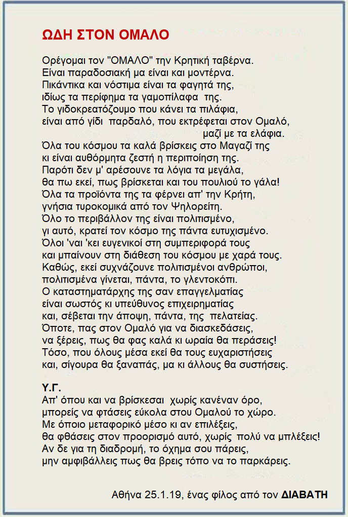Δευτέρα 30.12.19 Μετά την “Ζηνοβία” προσπαθούμε ώστε να μη μπει στον… πάγο και ο ΔΙΑΒΑΤΗΣ. Το είπε και ο κ. Αντώνης (Παντουράκης), ξέρετε ο διευθυντής του ΟΜΑΛΟΥ. Διότι πέρυσι μας έκλεισε την καλύτερη ημερομηνία, την 2η Κυριακή του Φεβρουαρίου, για τον ετήσιο χορό μας και την βασιλόπιτα. Τον καλοπιάσαμε πέρυσι, αν θυμάστε, με ένα ποίημα που μας έκανε δώρο ο κ. Γιώργος Κοκολάκης και σήμερα το αναρτούμε σε μορφή που να μπορεί να το τυπώσει…
