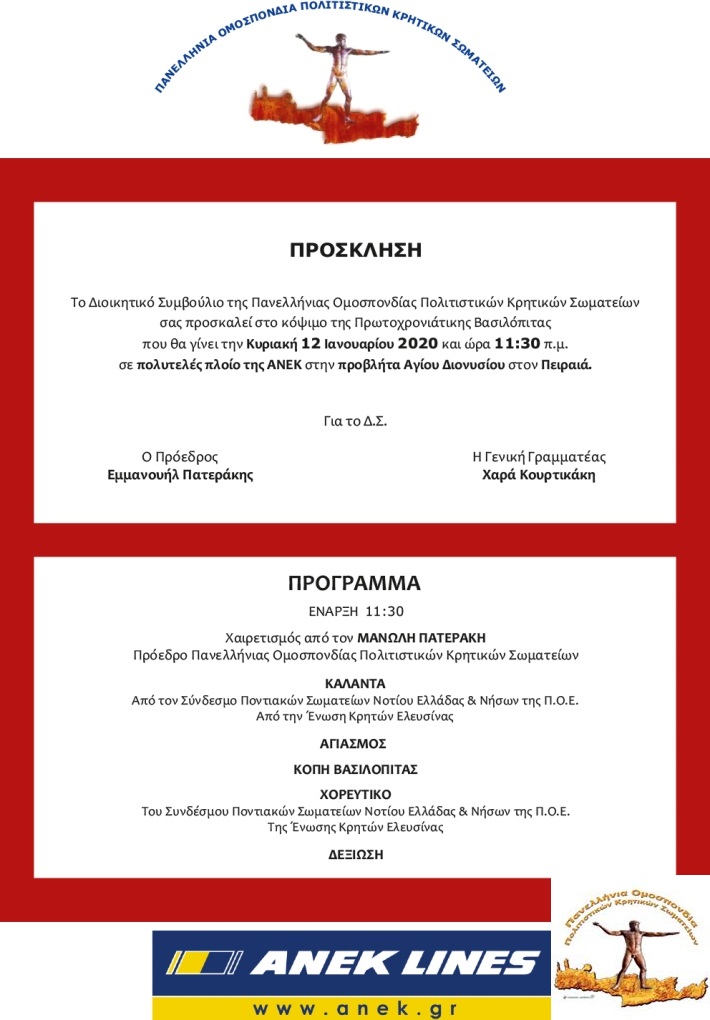 Η Πανελλήνια Ομοσπονδία Πολιτιστικών Κρητικών Σωματείων (Π.Ο.Π.Κ.Σ) έχει την χαρά και την τιμή να σας προσκαλέσει στην κοπή της Πρωτοχρονιάτικης Αγιοβασιλόπιτας της Ομοσπονδίας μας σε πλοίο της εταιρείας «ΑΝΕΚ LINES», στην προβλήτα του Αγίου Διονυσίου στον Πειραιά, την Κυριακή 12 Ιανουαρίου 2020 11:00 π.μ.